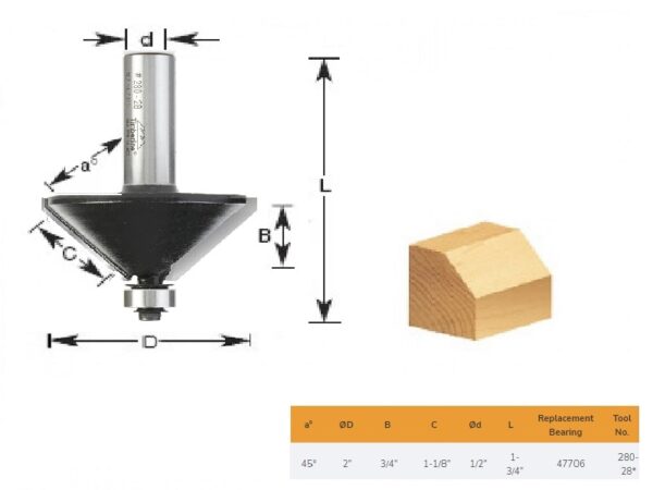 Fresa Bisel C/Rod.45° 2″ Eje 1/2″ 2 Filos Timberline
